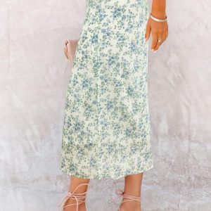 Women’s Floral Print Midi Skirt Casual High Elastic Waist Zipper Vintage Long Skirts for Women